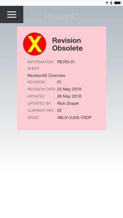 Outdated revisions are immediately identifiable by the icon and colour of the background displayed on scanning.